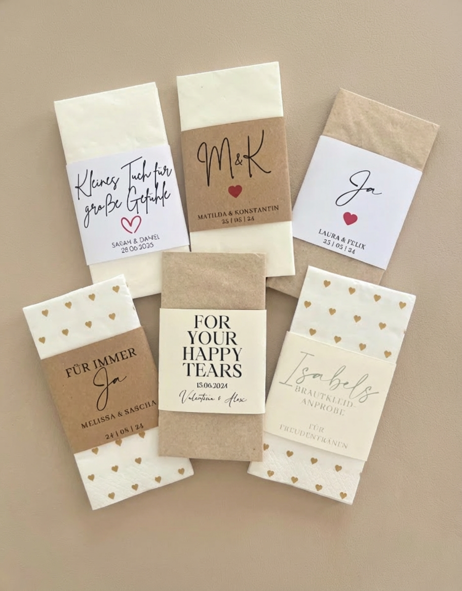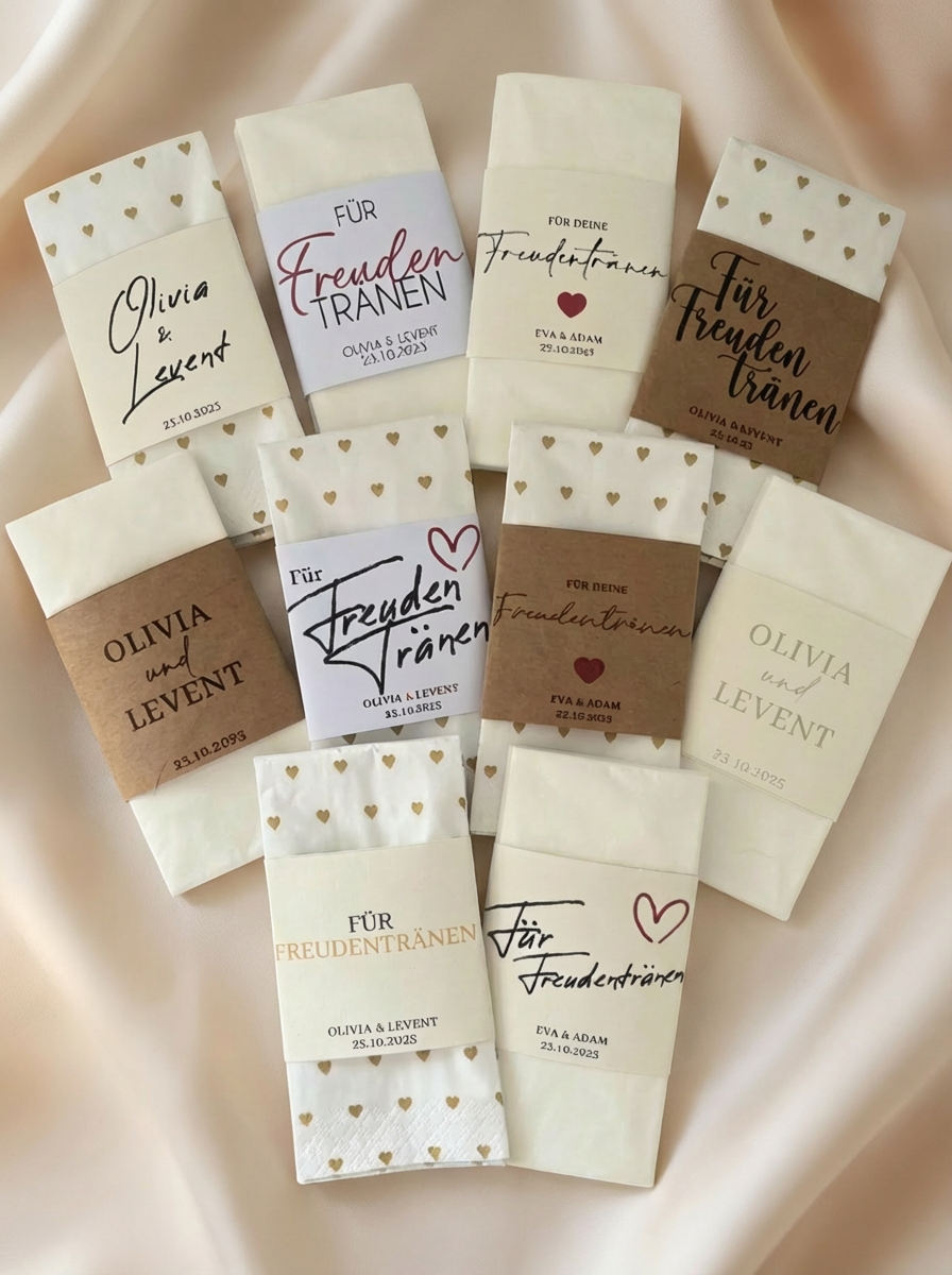Unsere liebevoll gestalteten Taschentücher sind das kleine Extra für große Emotionen. Ob für Freudentränen bei Hochzeiten, Taufen oder besondere Feiern – jedes Taschentuch ist individuell bedruckt und passt perfekt zu deiner Papeterie. So werden selbst die zarten Momente unvergesslich.